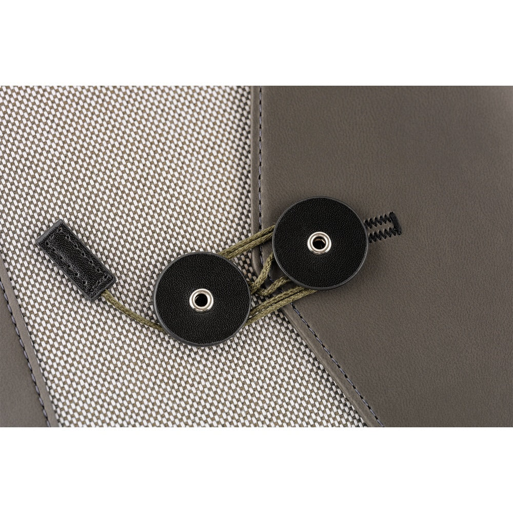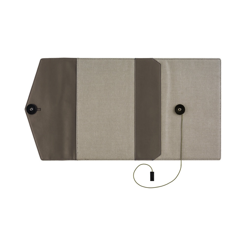 This is an envelope-style cover with a string-and-button closure, titled Letter. The design features a triangular flap and a combination of two contrasting fabrics with different textures.