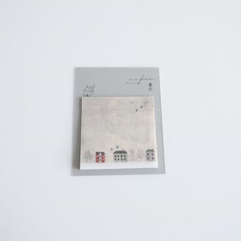 The transparency, like frosted glass, and the texture of the paper are beautiful. Add a message to a gift or stick them on a clear file containing documents. You can also create a lovely page by taking advantage of the transparency in your favorite notebook and combining stamps, tracing sticky notes, and masking tape. Some writing implements, such as fountain pens, cannot write on tracing paper. I always use gel pens, but sometimes I can't write on them. In those cases, using a new pen solves the problem. Oil-based pens can write without any problems. If you use gel pens, please let them dry without touching them after writing.