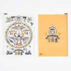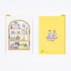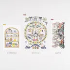 The A6 size design is Teapot Shelf. Teacups and saucers, fruits and biscuits, an hourglass and other such items that are must-haves for tea time are lined up on the shelves. On the back, a little girl wearing a dress and a bear are having a merry little chat.