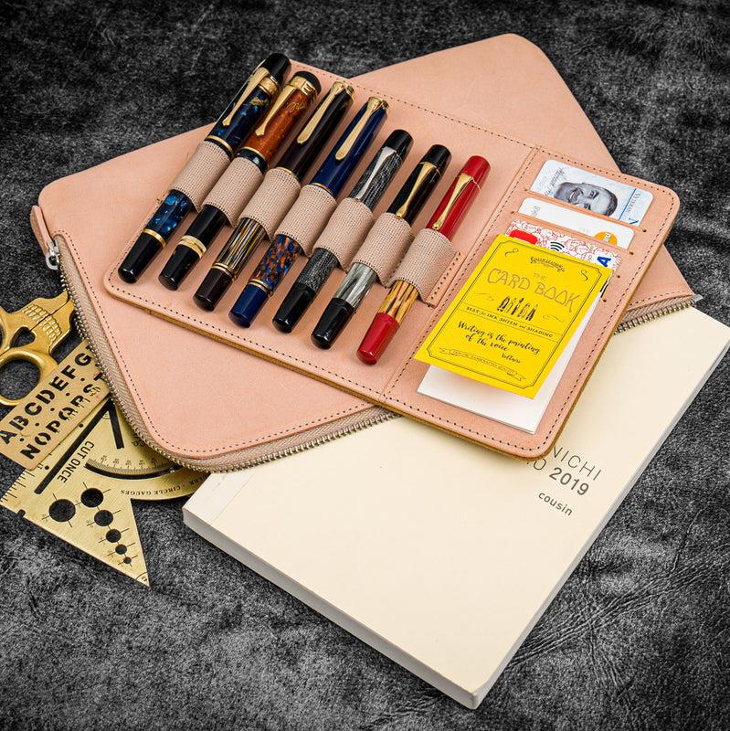 This versatile case features a removable insert with pen loops and card slots, allowing you to carry an A5-sized notebook or journal. It accommodates all pen sizes, including oversized pens, and includes a dedicated slot on the back for a notebook or notepad. Made from durable vegetable-tanned leather with a YKK heavy-duty zipper, this case combines functionality and premium quality.