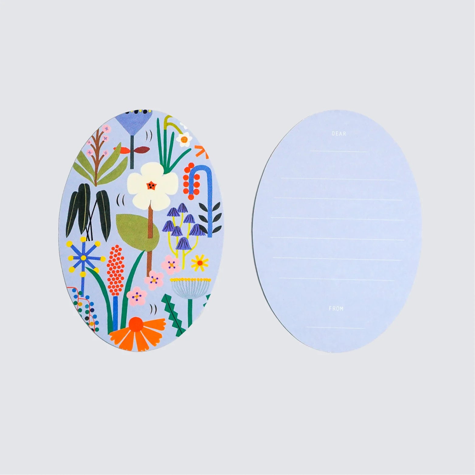 A vibrant card featuring flowers and plants crafted from hand-cut paper. The back provides six lines for writing a thoughtful message.