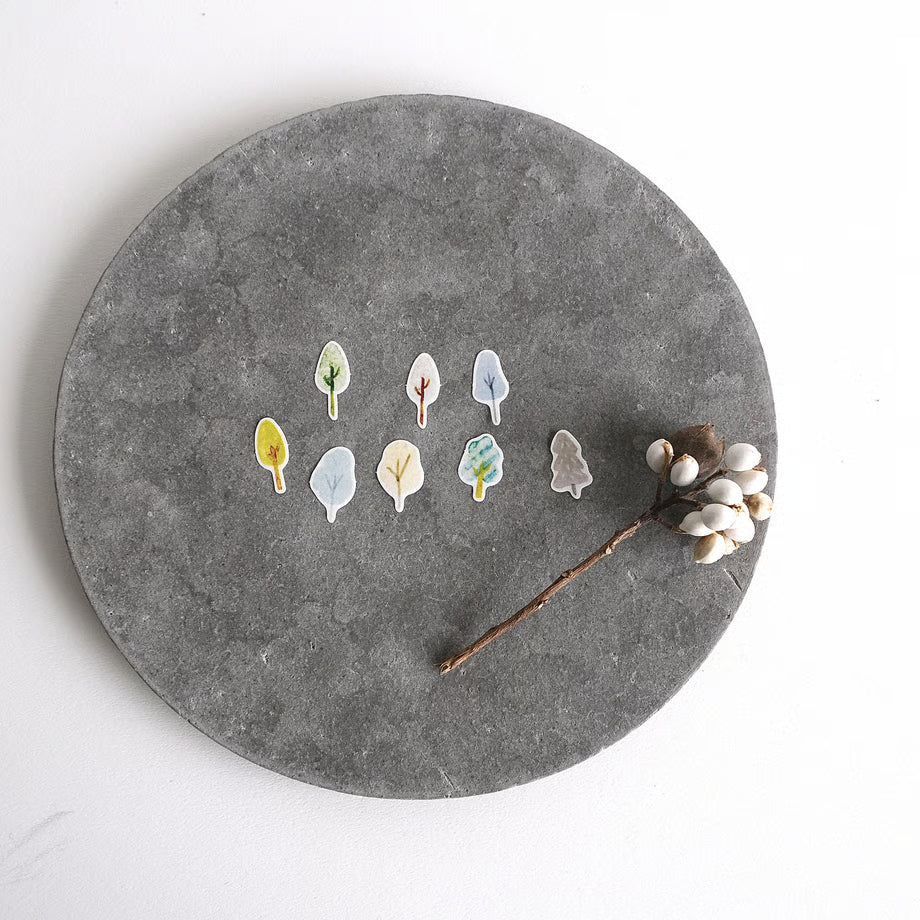 Morino Ookude Popular flake stickers are made with washi. Enjoy the transparency and ease with which you can peel these off if you so wished. Yohaku said: 'Cute little trees. I wanted to put trees around the lake, so I made these. Very cute.'