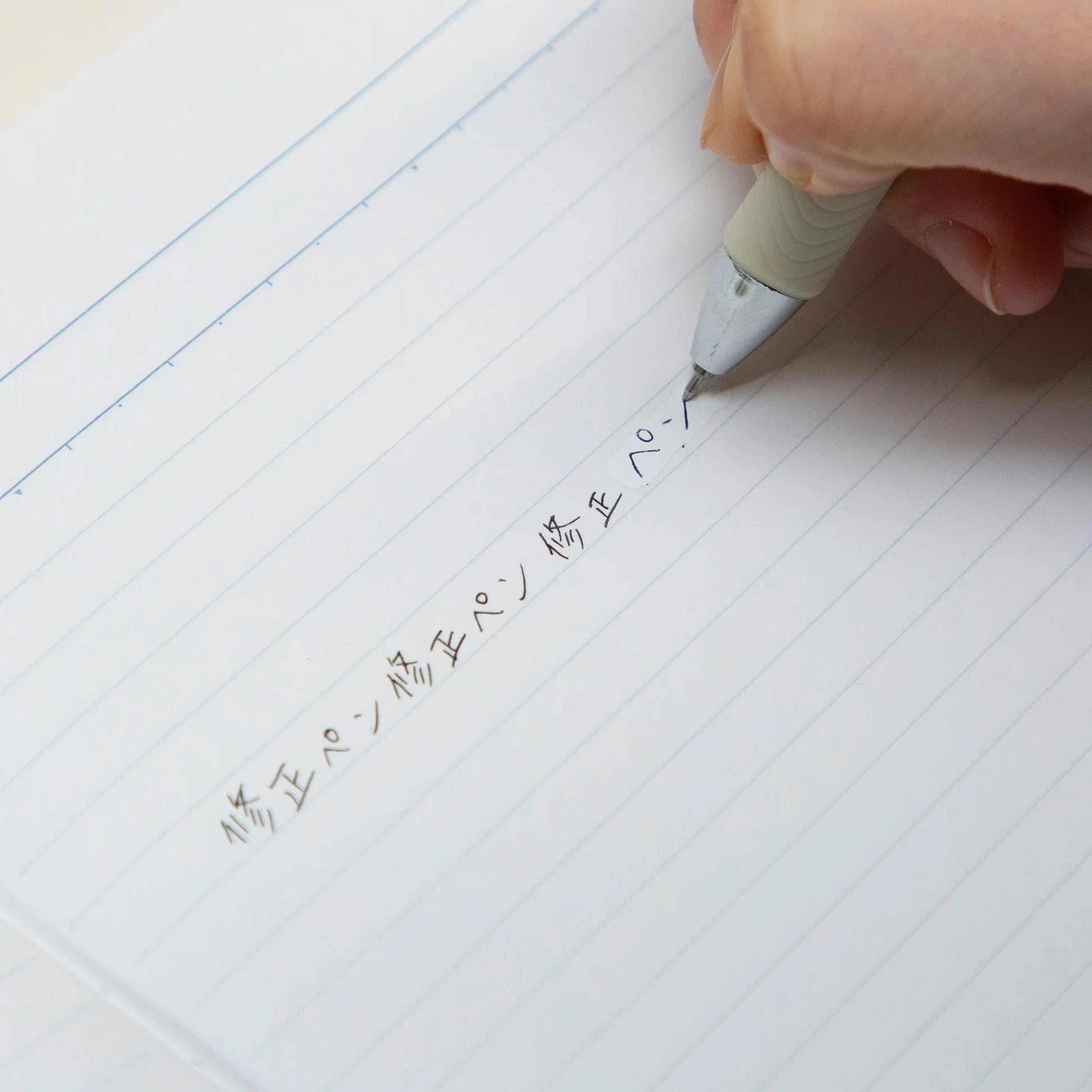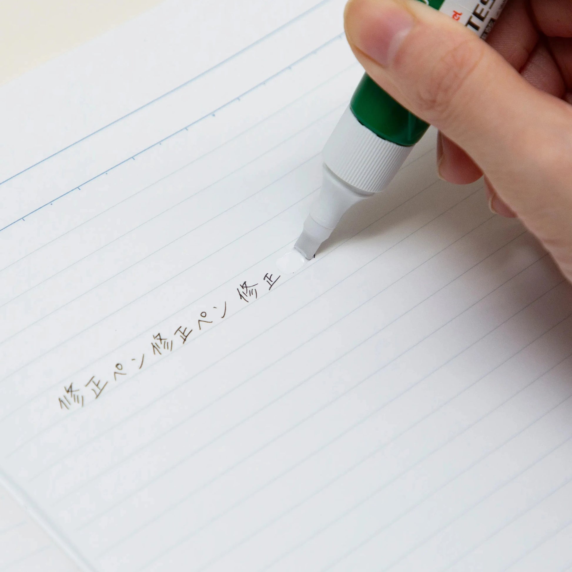 A newly developed pen tip with a new shape allows for corrections over a wide range of approximately 4.5 mm in one stroke. Even those who have problems with correction tape, such as the tape twisting, holes forming, or not cutting properly, can easily use it.